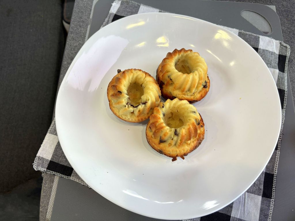 Den Teig in kleinen Gugelhupfformen geben und auf 180 grad Celsius , 20 min. backen